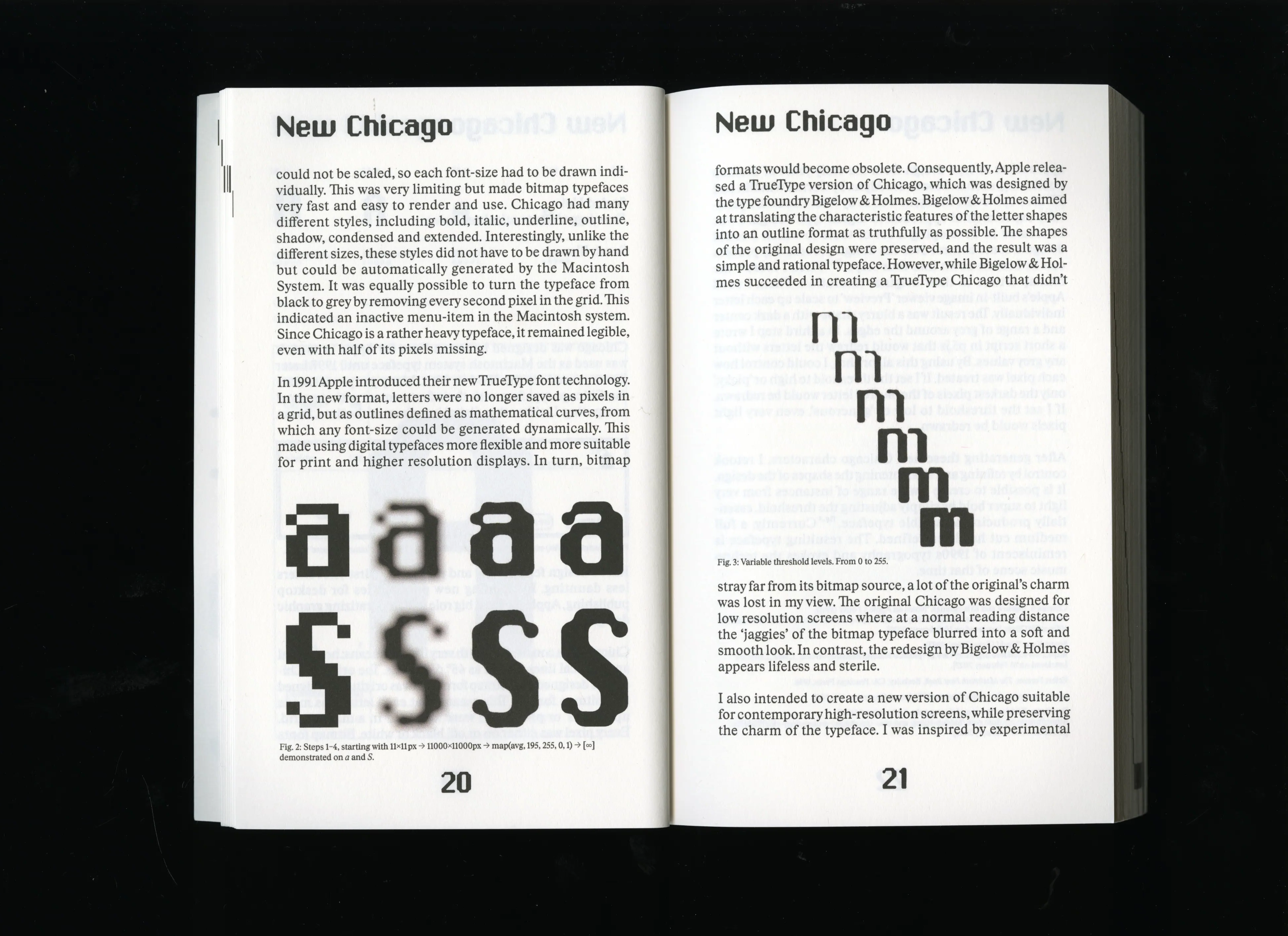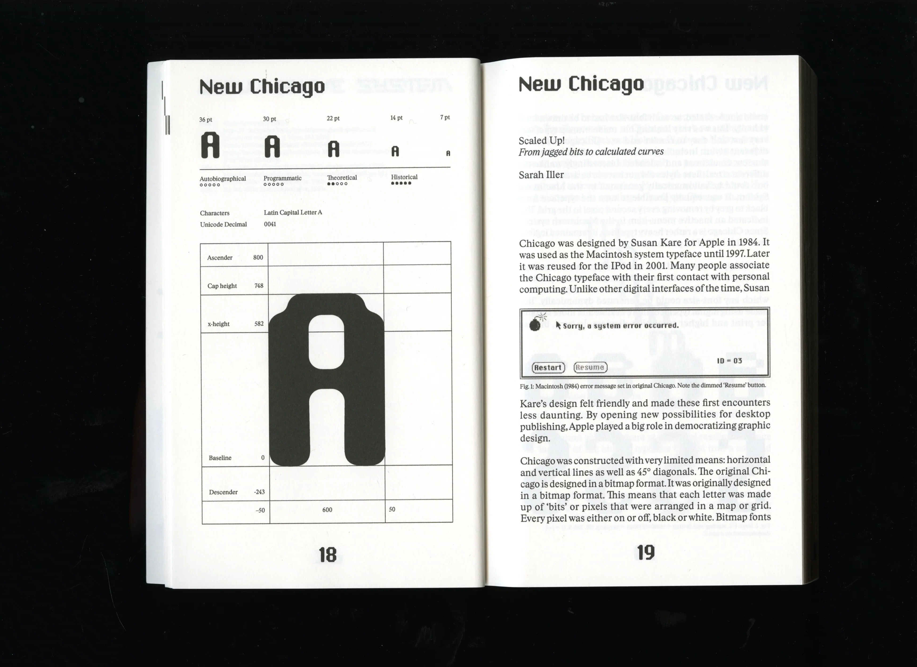 New Chicago is based on the iconic bitmap font “Chicago” designed by Susan Kare for the first